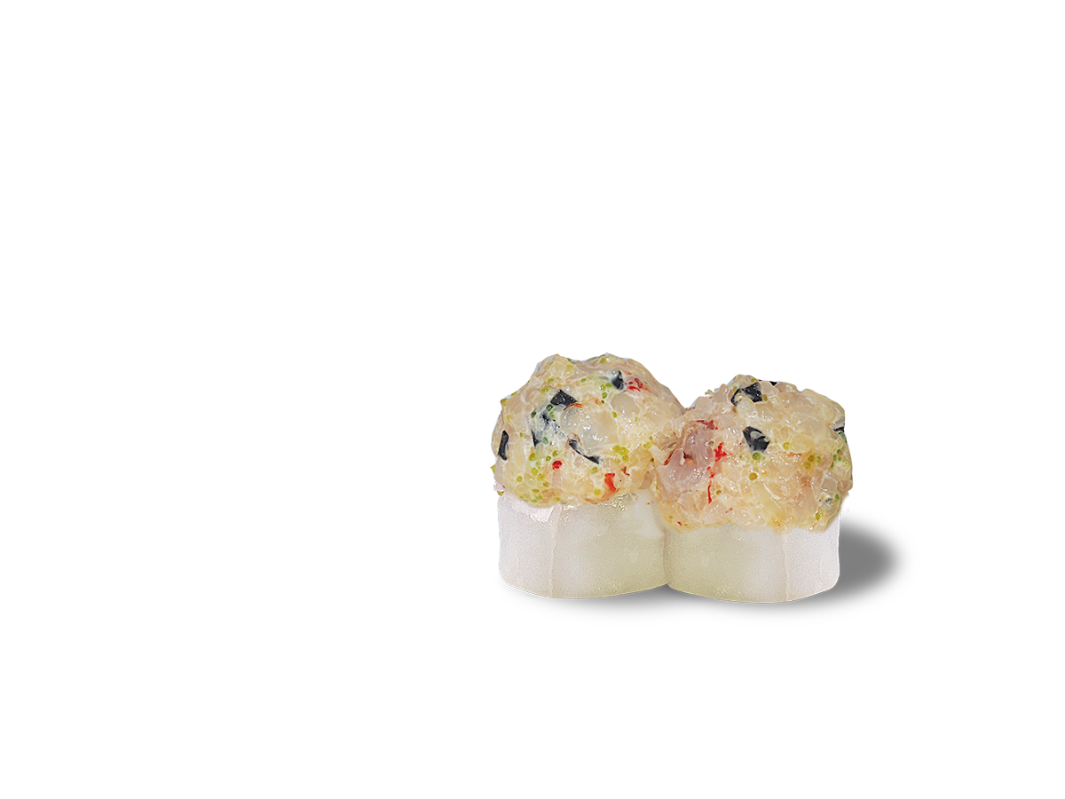 gunkan alla ricciola e gambero rosso di Mazara del Vallo guarnito con oro 24k, caviale di storione e salsa ponzu