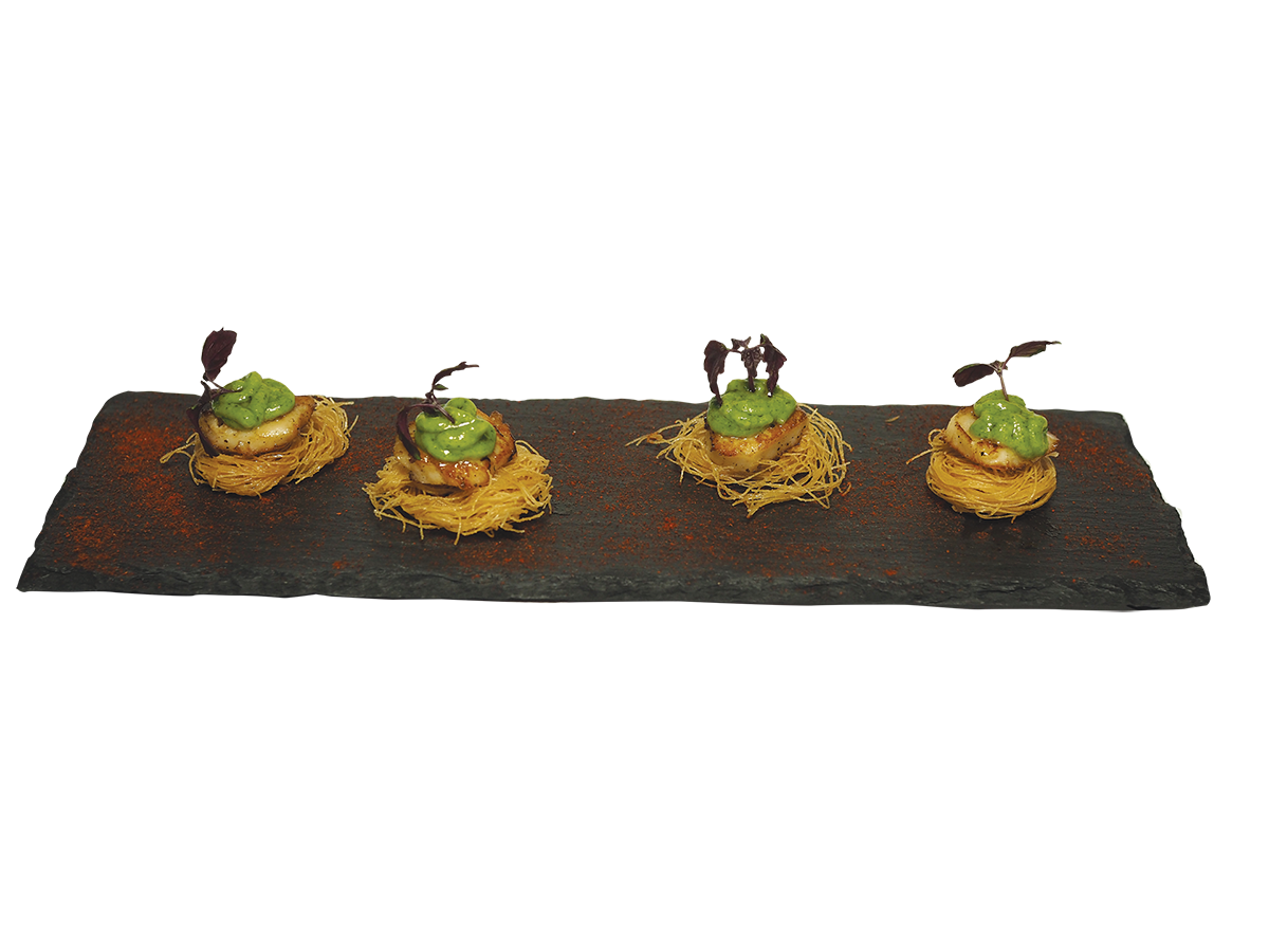 Capesante scottante su nido di rondine con salse di avocado