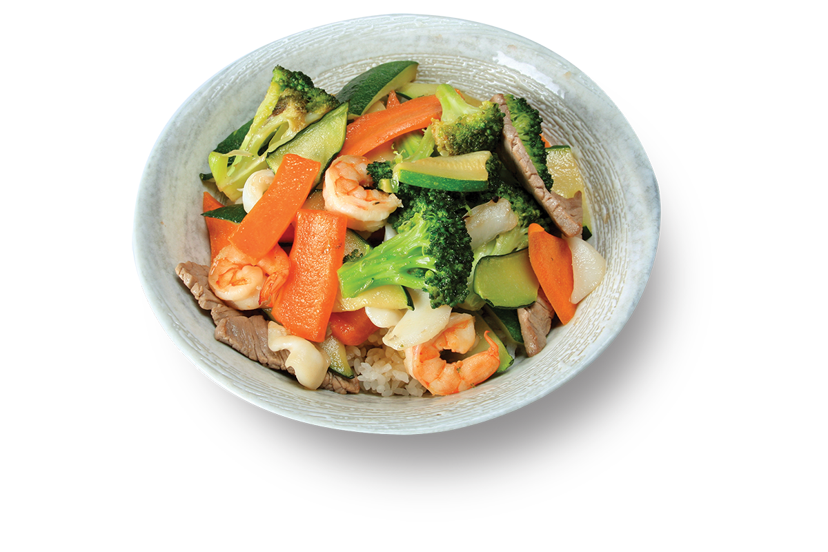 riso con verdure spadellate, gamberi e calamari
