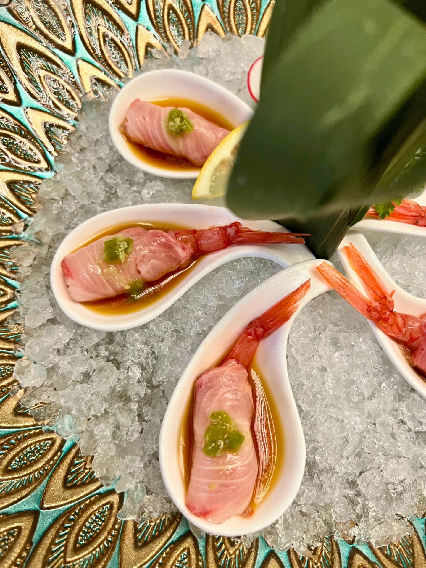 4 pz di gambero rosso di mazara avvolto da branzino, guarnito con kizame wasabi e salsa ponzu