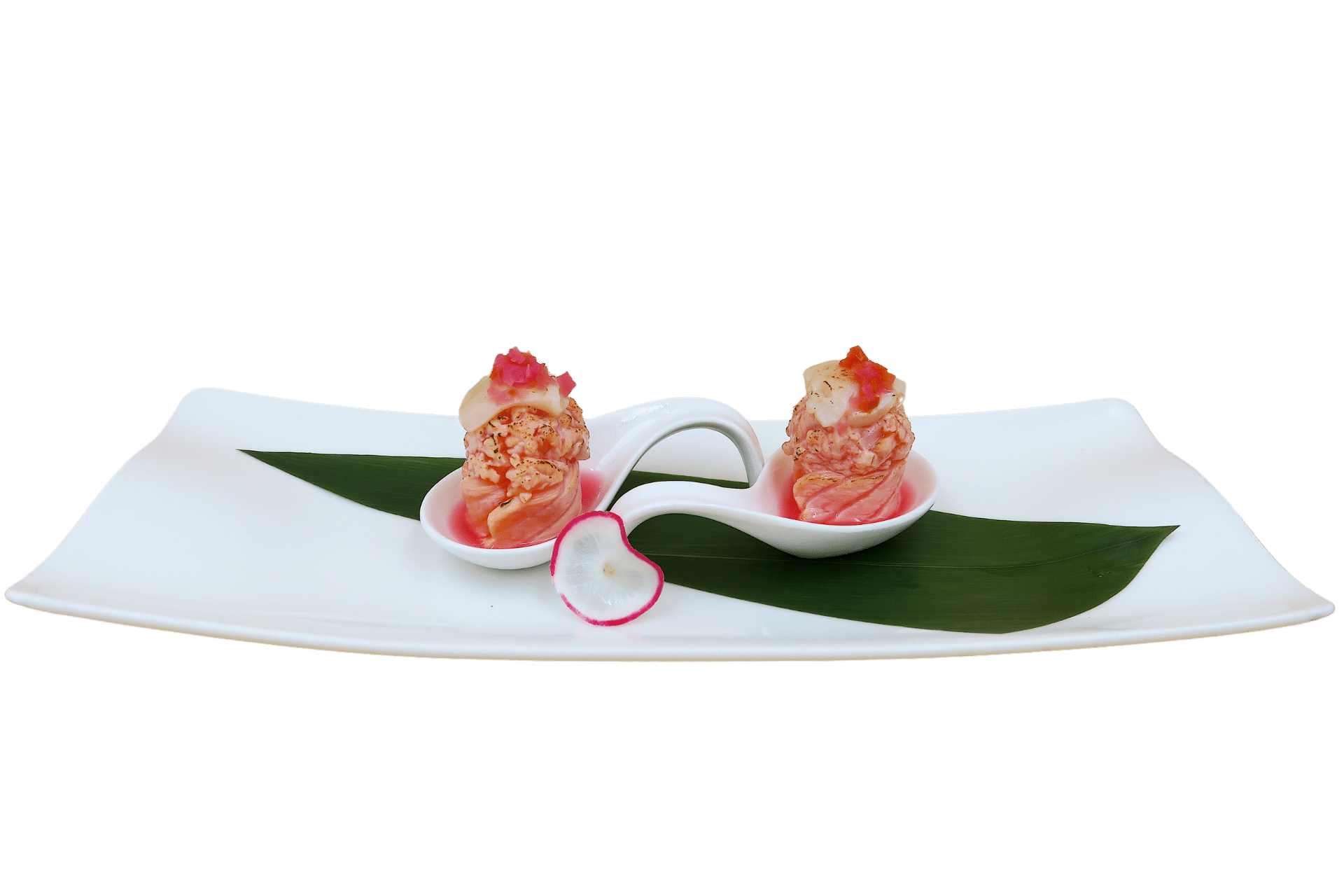 Gunkan al salmone e capasanta alla fiamma con salsa alla cevice