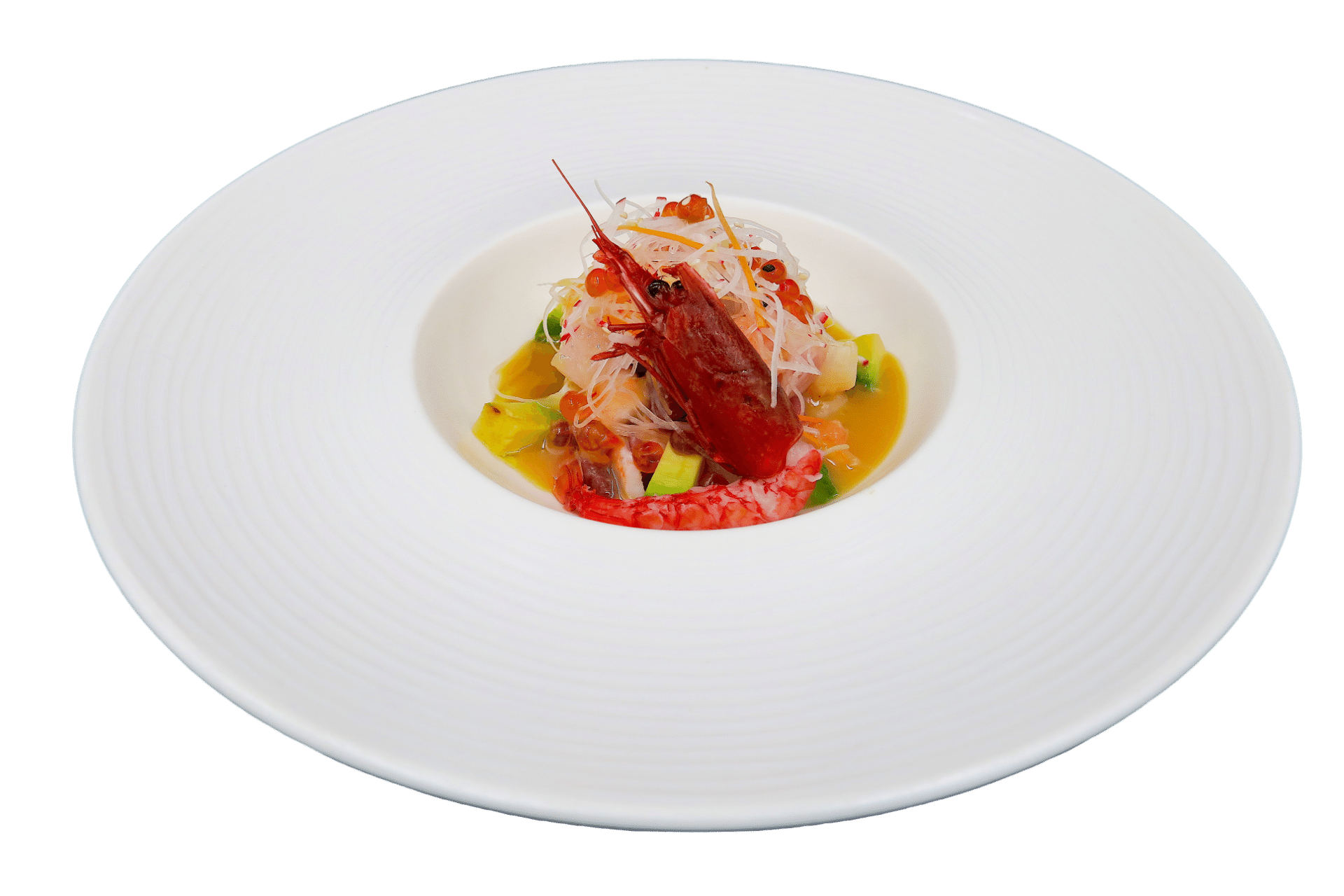Tartare mista di salmone, tonno, ricciola con salsa di miso arromatizzato allo yuzu arricchito con kizame di verdure, uova di salmone marinato e gambero rosso di Mazara del Vallo