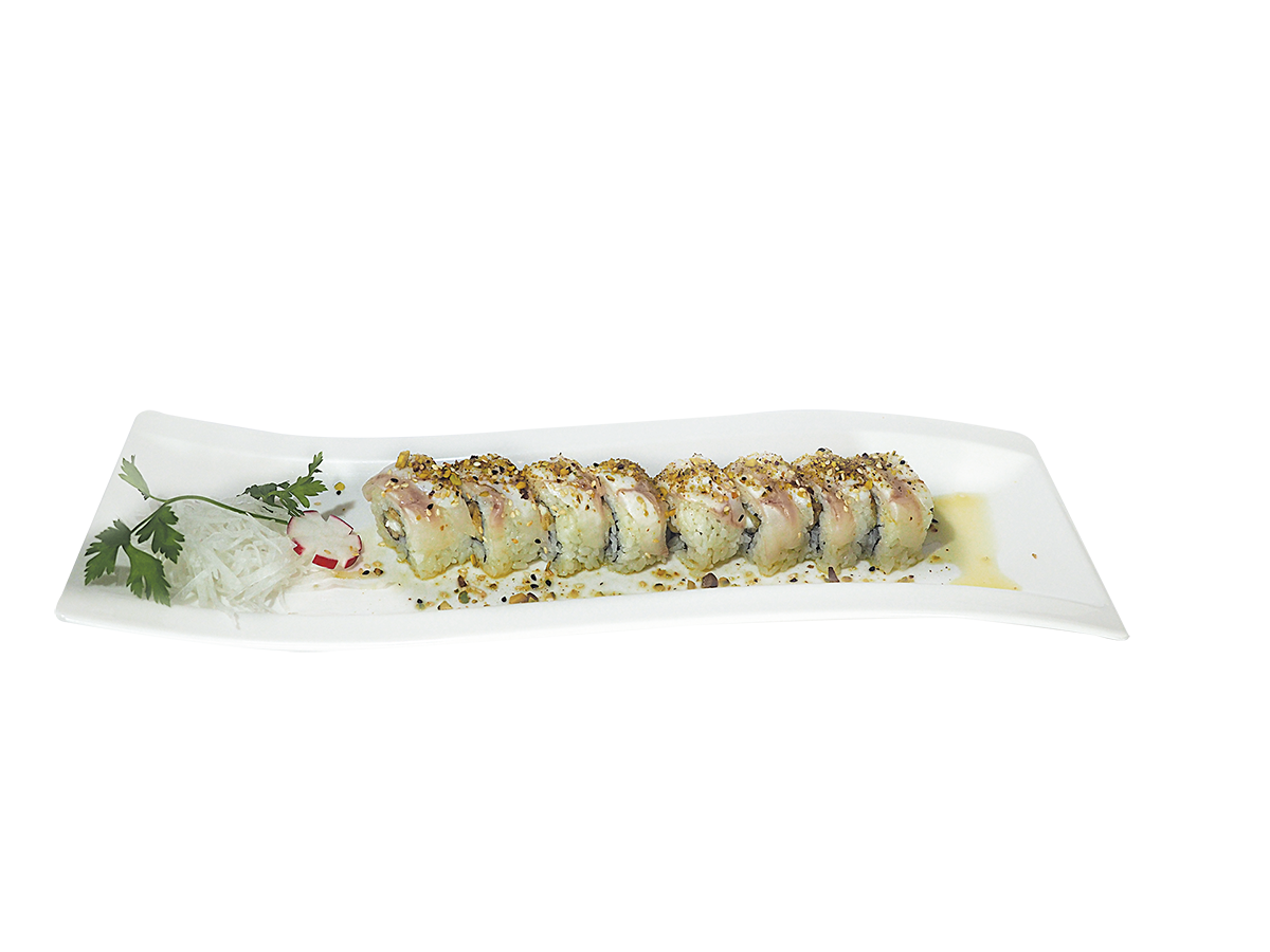 roll al salmone tritato avocado guarnito da gambero argentino scottato alla fiamma salsa rucola e friggitelli toscana